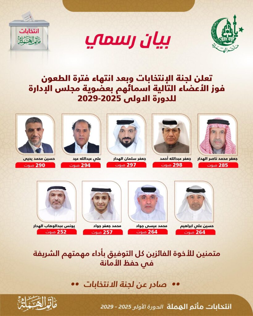 أعلنت لجنة الانتخابات بمأتم الهملة عن اعتماد النتائج النهائية لانتخابات أعضاء مجلس الإدارة للدورة الأولى (2025 – 2029)، وذلك عقب انتهاء فترة الطعون الرسمية دون تسجيل أي طعن من قِبل المترشحين.