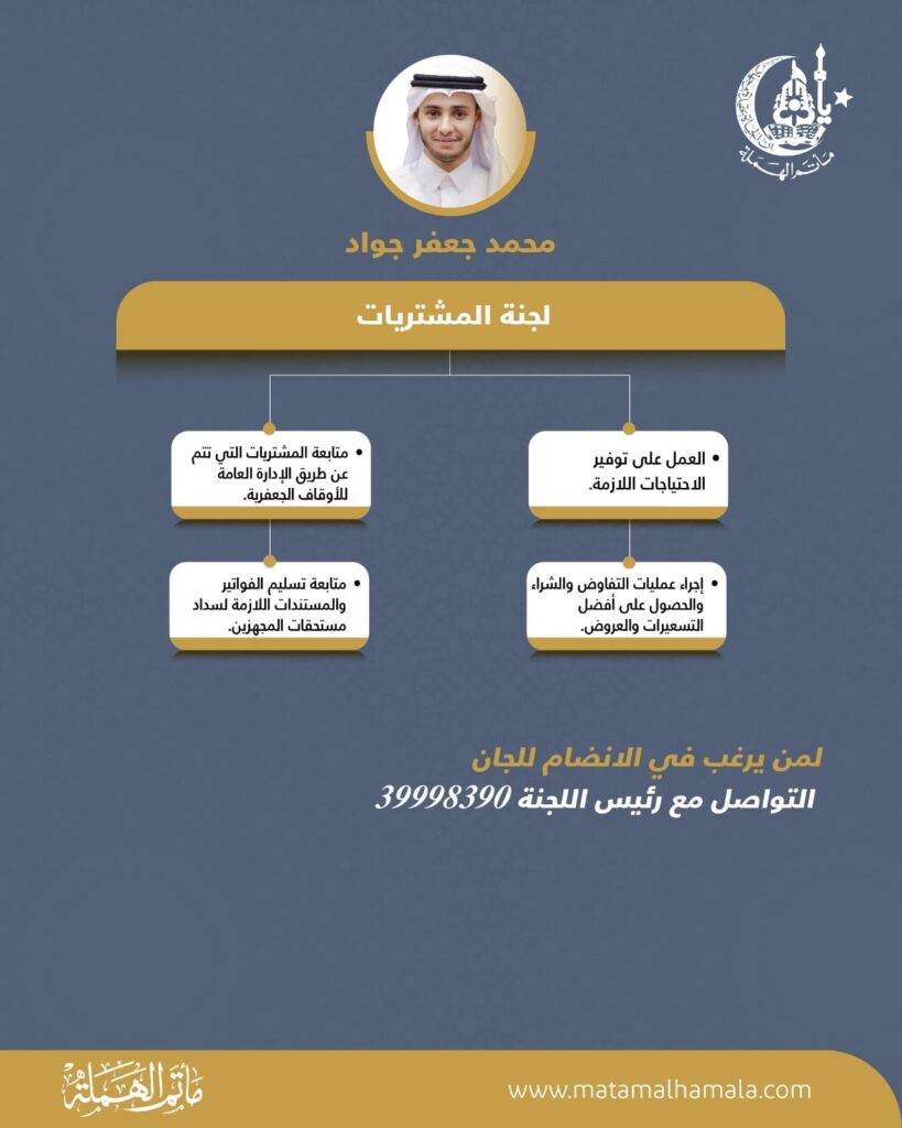 ويأتي هذا الإعلان في إطار الاستعداد المبكر لتنظيم البرامج والفعاليات الدينية، وحرصًا على إتاحة الفرصة لأبناء المأتم للمشاركة في خدمة الإمام الحسين وأهل بيته عليهم السلام، وهي الخدمة التي نعدها شرفًا وعطاءً لا يُقدّر بثمن.