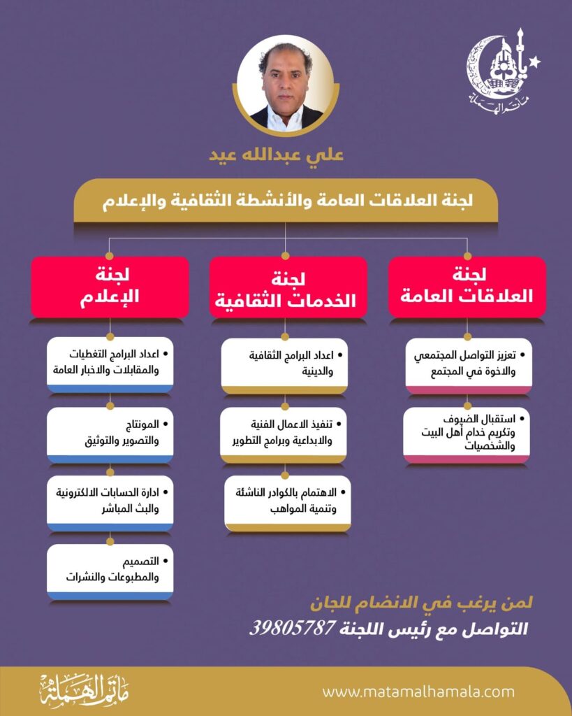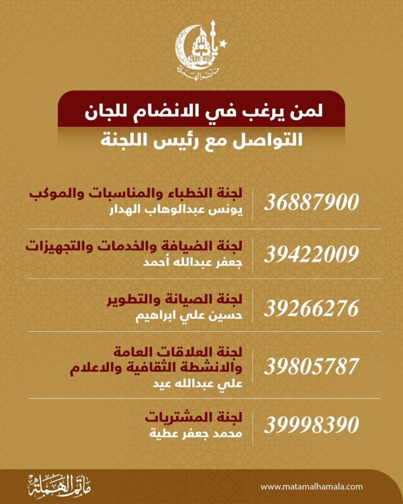 يسر مجلس إدارة مأتم الهملة أن يعلن عن فتح باب التسجيل للانضمام إلى عضوية اللجان العاملة خلال الموسم القادم، وذلك ابتداءً من يوم الأربعاء 11 يونيو 2025 وحتى يوم الثلاثاء 17 يونيو 2025.